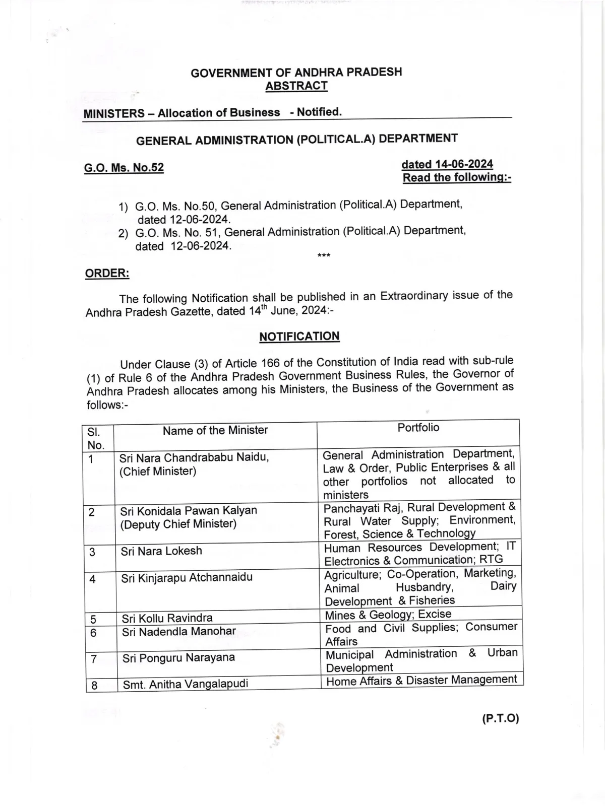 1Nara Chandrababu Naidu (CM)GAD, Law & Order, Public Enterprises & all other portfolios not allocated to ministers