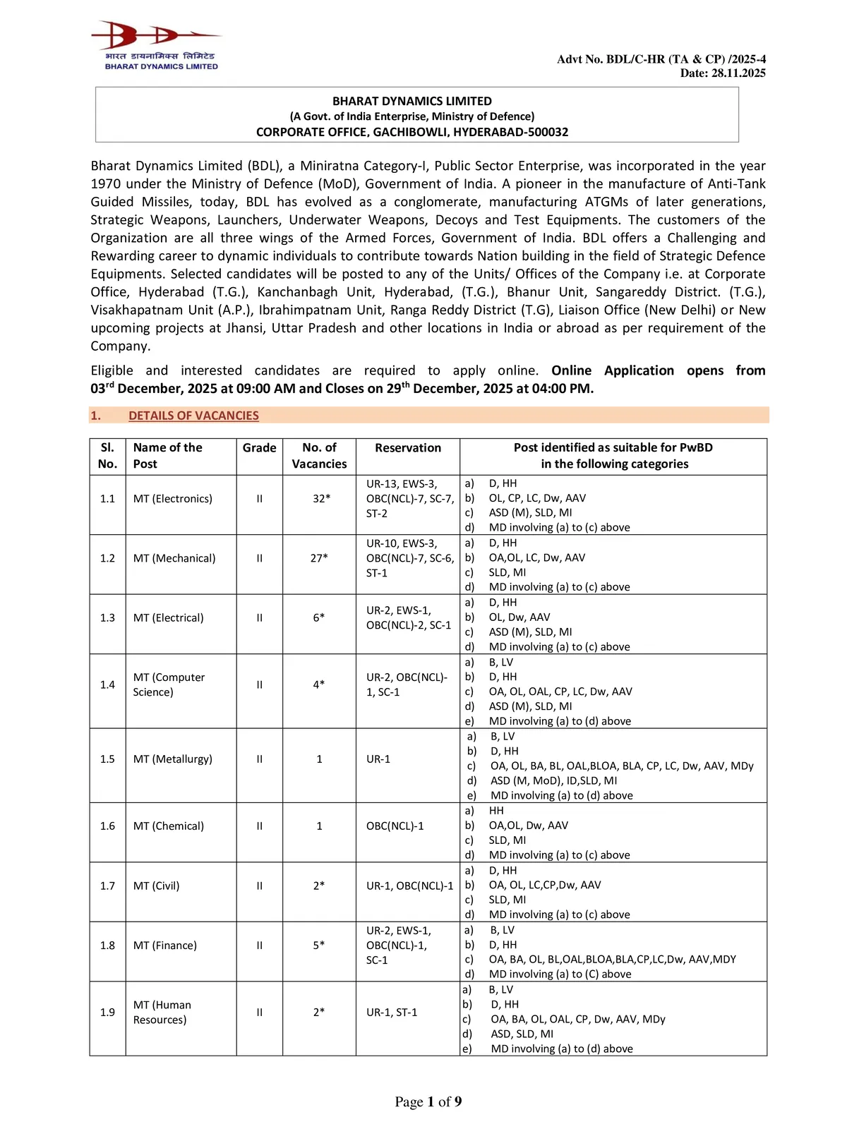 Eligible candidates must apply online for 80 vacancies under BDL MT Recruitment 2025 from 3rd December 2025 onwards by visiting the official website of BDL, https://bdl-india.in/.