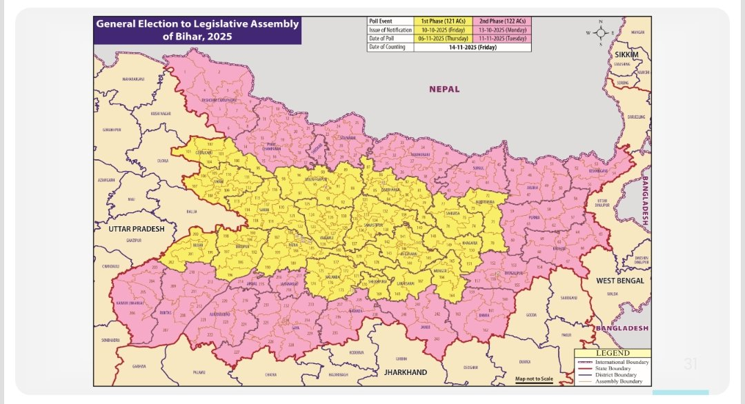 Bihar Election 2025 schedule announced by the Election Commission of India from the official website. The Election Commission of India has announced that the Bihar Assembly elections will be conducted on November 6 and 11 in two phases. The counting will be on November 14.