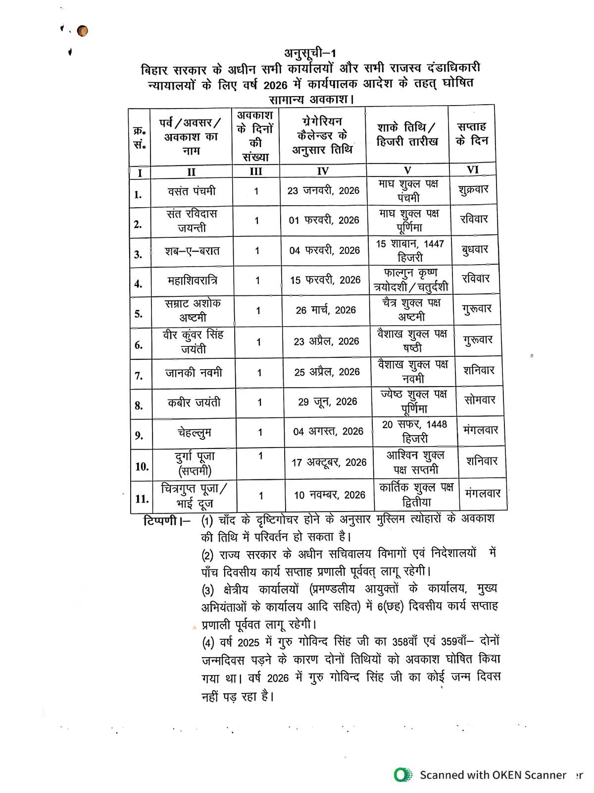 Bihar Government Holiday List for the Year 2026