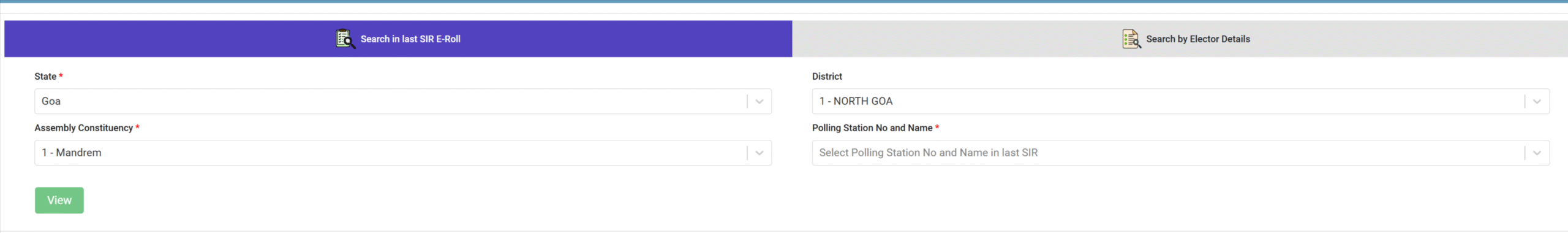 Step 1: After choose search in last SIR E-Roll – You have to select the “State”,”District”,”Assembly Constituency”,”Polling Station No and Name and then click on “View” Button as the screenshot shown below.