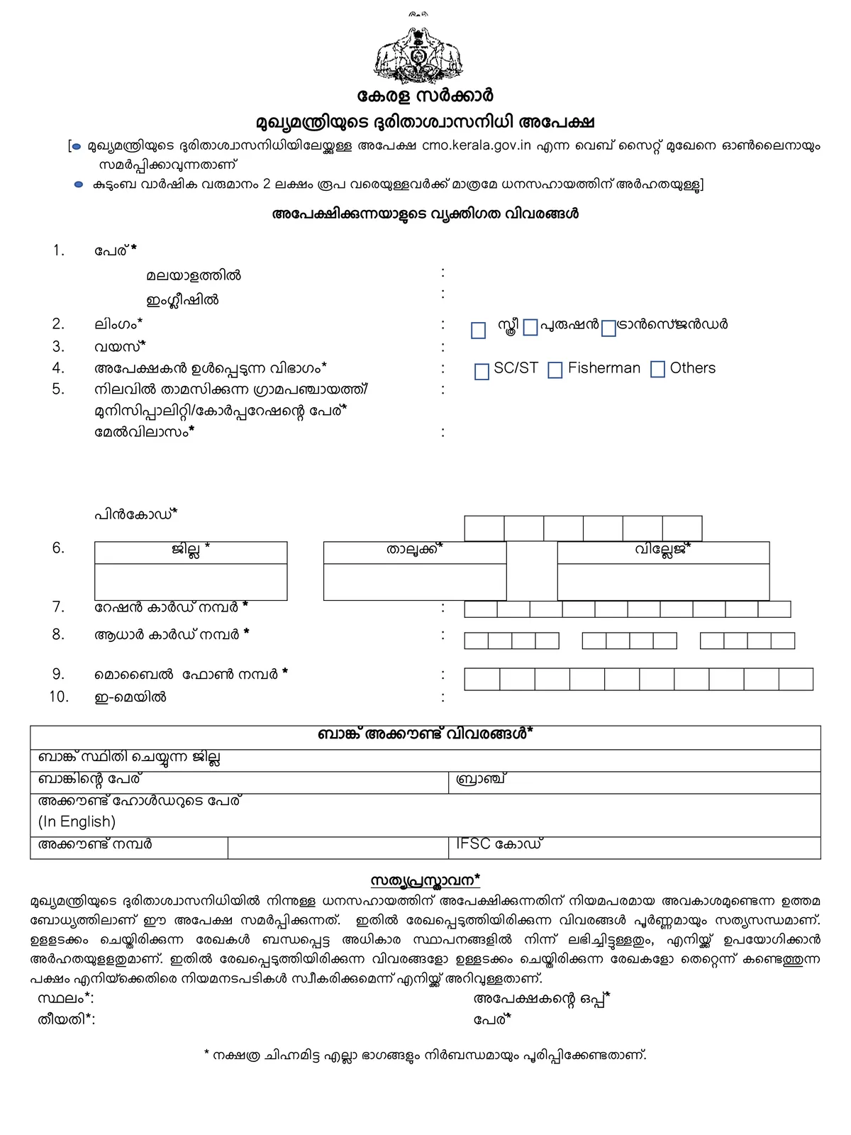 CMDRF Application Form is used to apply for financial assistance from the Chief Minister’s Distress Relief Fund (CMDRF). This fund helps people who are affected by natural disasters such as floods, landslides, or other emergencies. It provides financial aid to families and individuals who have suffered loss of life, property, or livelihood. The form collects important details like the applicant’s name, address, type of loss, and bank details for fund transfer.