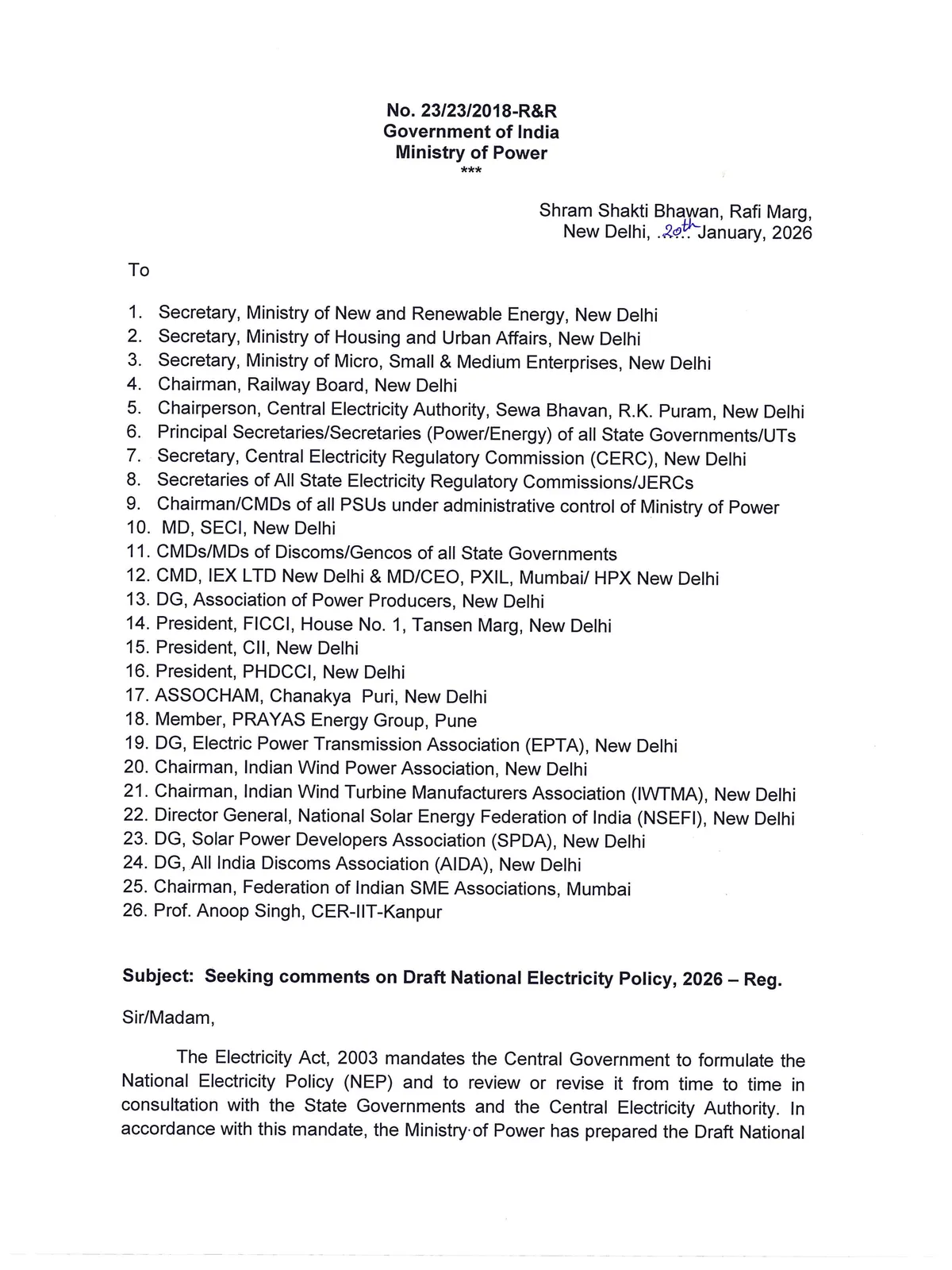 The Ministry of Power announced the release of a new “Draft National Electricity Policy (NEP) 2026”. The Draft NEP 2026 aims to transform the power sector for meeting the vision of Viksit Bharat @2047. The policy, once finalised, intends to replace the existing NEP which was notified in 2005.