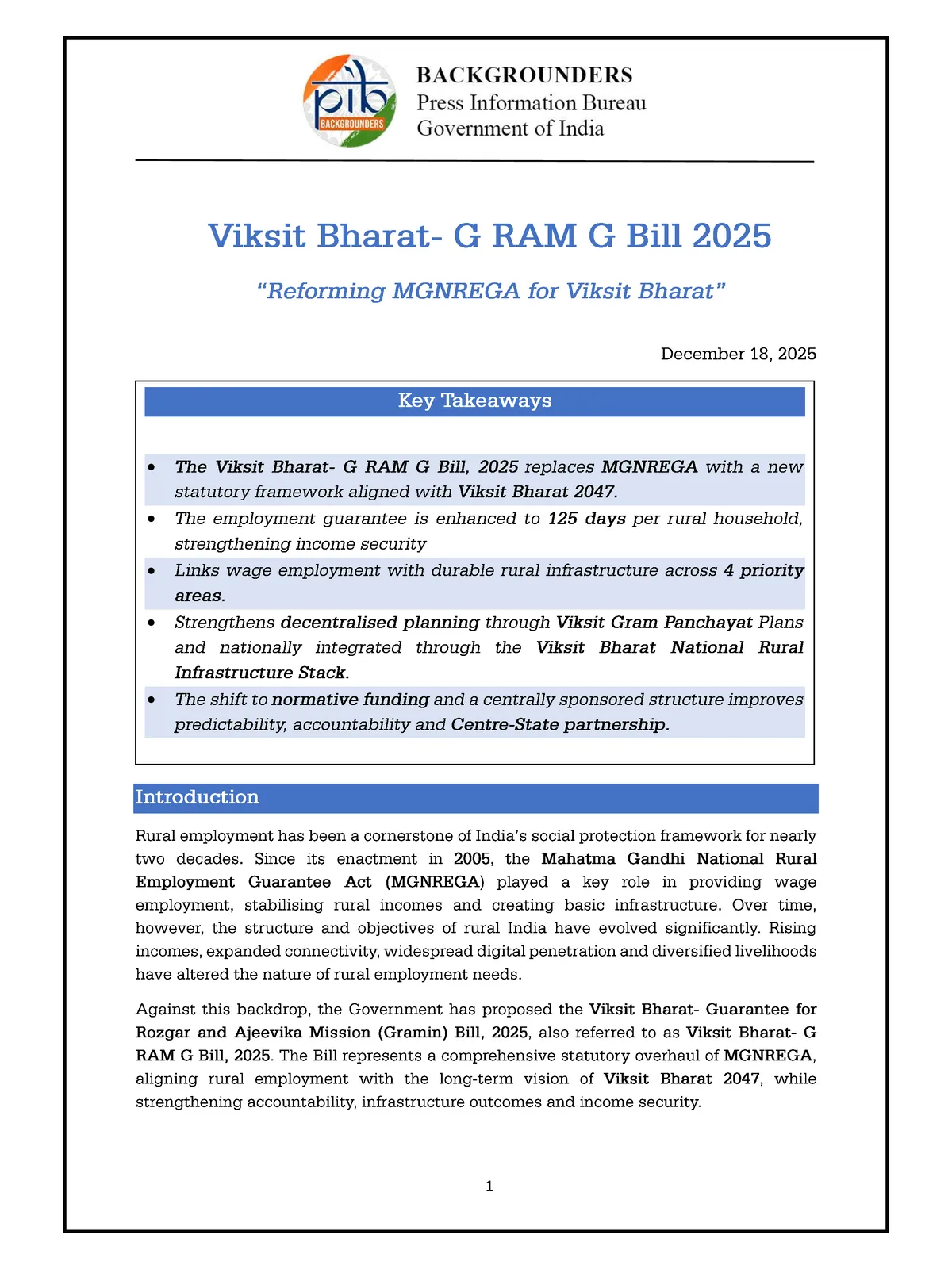 Indian Government has proposed the Viksit Bharat- Guarantee for Rozgar and Ajeevika Mission (Gramin) Bill, 2025, also referred to as Viksit Bharat- G RAM G Bill, 2025. The Bill represents a comprehensive statutory overhaul of MGNREGA, aligning rural employment with the long-term vision of Viksit Bharat 2047, while strengthening accountability, infrastructure outcomes and income security.