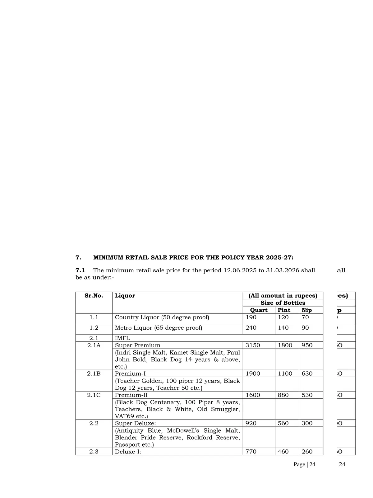 Sr. No. | Liquor Category | Quart | Pint | Nip |