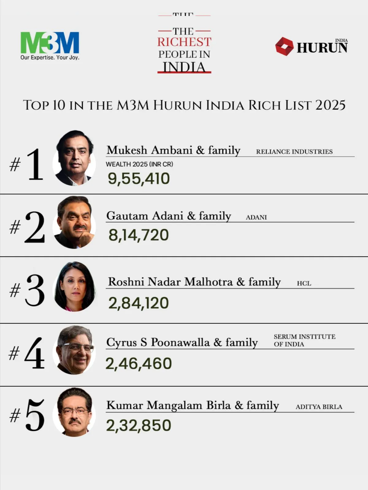 Mukesh Ambani and his family are once again the richest in India, with a net worth of ₹9.55 lakh crore. This news is from the 14th edition of the M3M Hurun India Rich List 2025, released by M3M India along with the Hurun Research Institute. Just behind them are Gautam Adani and his family, with a wealth of ₹8.14 lakh crore. It shows that the competition for the number one spot in India’s richest list is mainly between these two business giants.