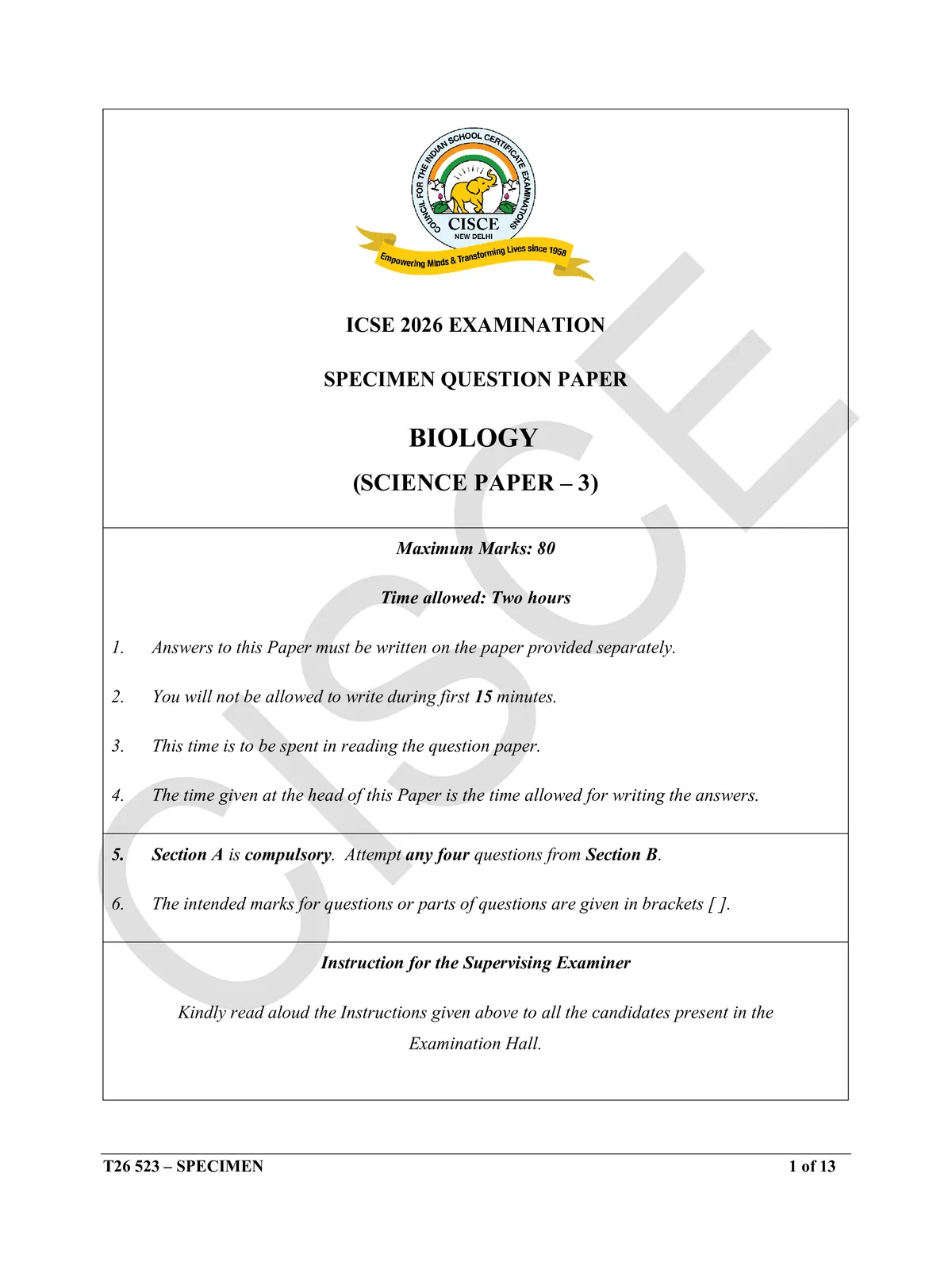 | Official Specimen Paper | ICSE Biology Specimen Paper 2026 |