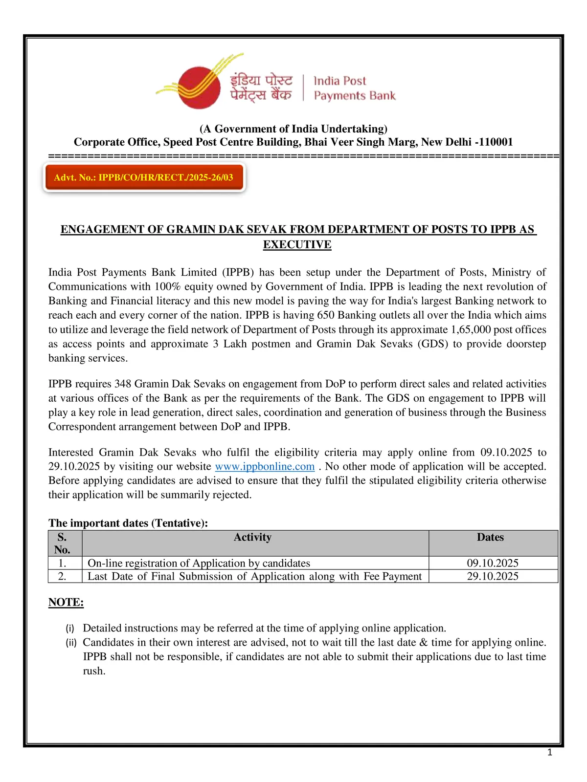India Post Payments Bank (IPPB) has released a notification in 2025 for recruiting new Executives (Gramin Dak Sevaks). There are 348 open positions. Applications will be accepted online from 9 October 2025 to 29 October 2025.