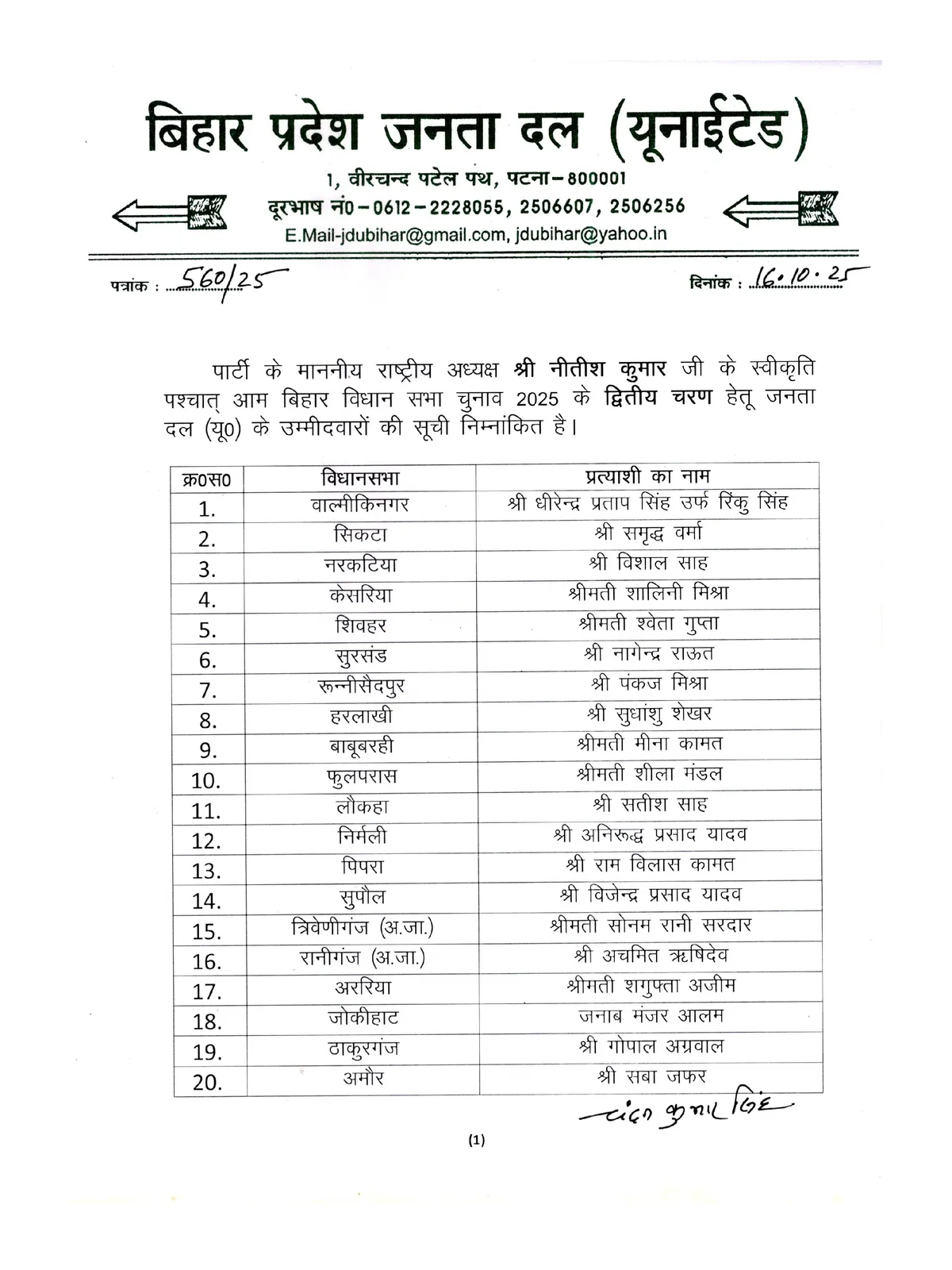 जनता दल यूनाइटेड (JDU) ने अपने उम्मीदवारों की दूसरी सूची जारी कर दी है, जिसमें 44 नाम शामिल हैं। इससे पहले पार्टी 57 उम्मीदवारों की पहली सूची जारी कर चुकी थी। इस तरह एनडीए गठबंधन में शामिल जदयू ने अपने हिस्से की सभी 101 सीटों के उम्मीदवारों की घोषणा पूरी कर ली है। बिहार विधानसभा चुनाव के पहले चरण के लिए नामांकन की अंतिम तिथि 17 अक्टूबर यानी कल है, और आज कई प्रमुख नेता अपना नामांकन दाखिल करेंगे।