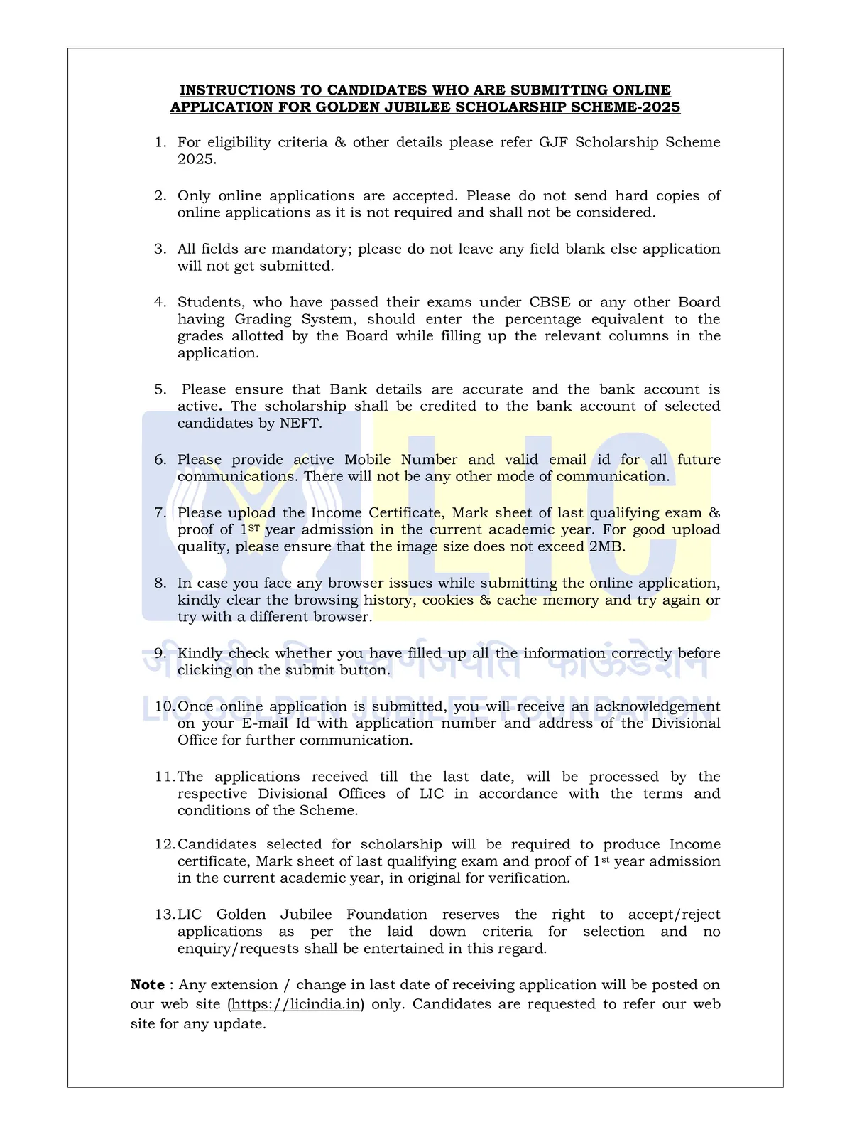 LIC Golden Jubilee Scholarship 2025 Application Form - Summary