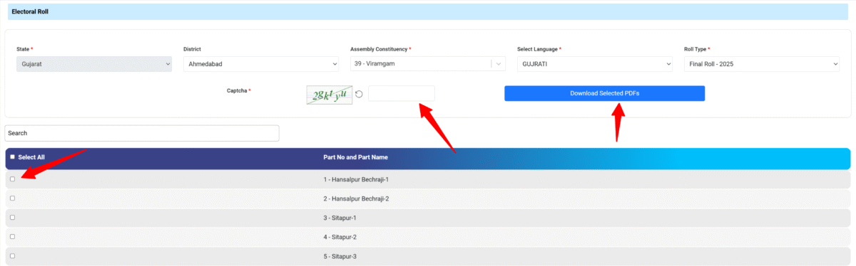 STEP 3: After that, applicants select the “District”, “Assembly” , Language and Roll Type. Then select the Part No and number and enter the captcha code to download the Matdar Yadi 2025 Gujarat PDF as the image is shown below.