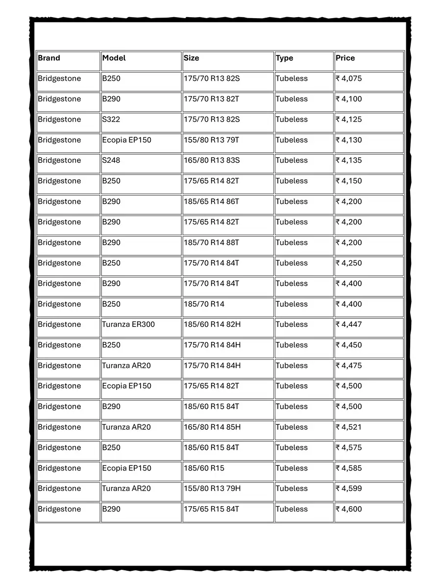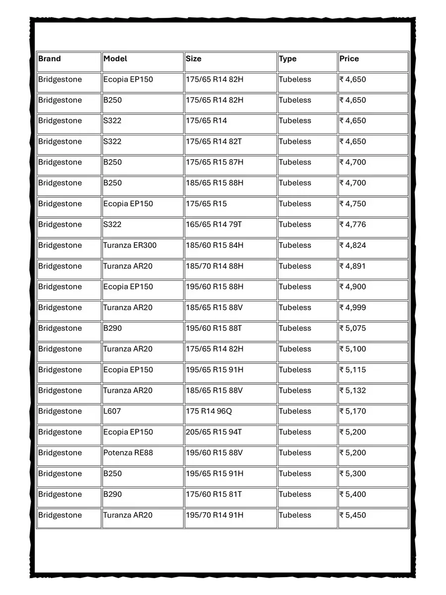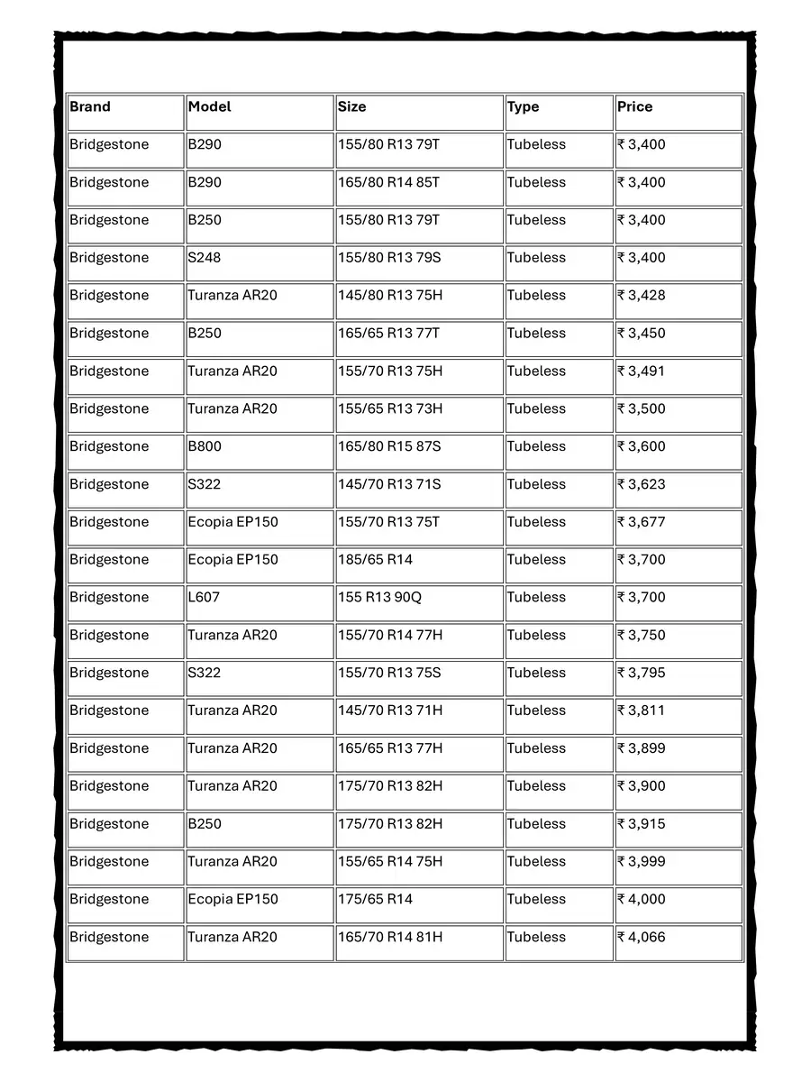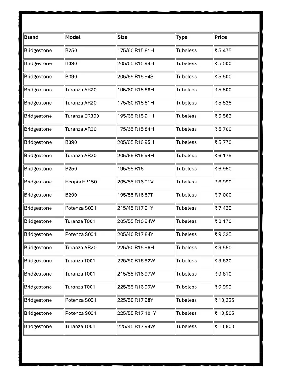 Bridgestone Tyre New GST Price List 2025