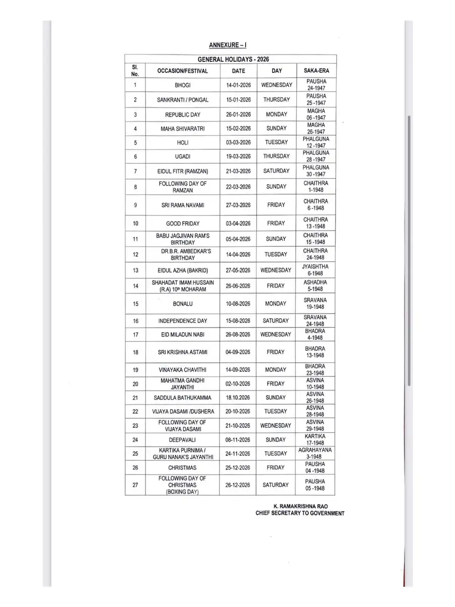 Telangana Government Holidays List 2026