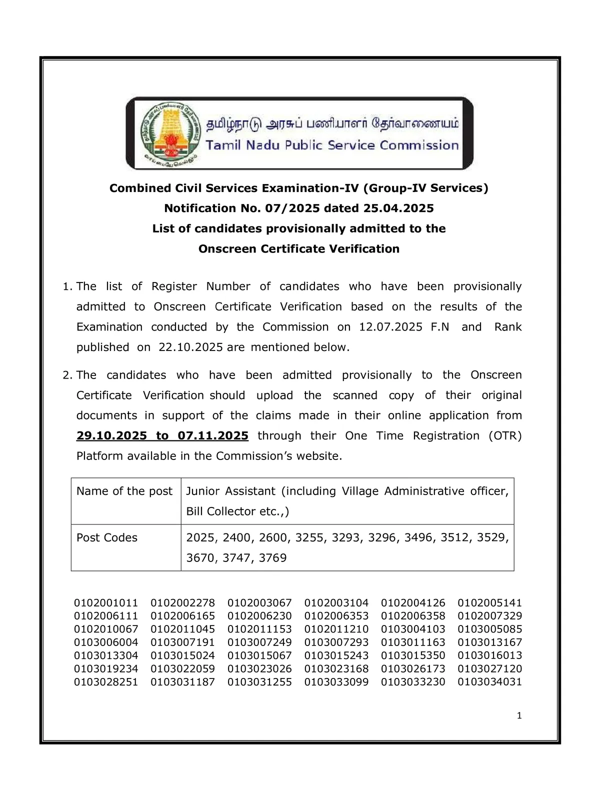 TNPSC has already completed the Group 4 written exam and released the results and rank list. Now, the selection process moves to the next important step — Certificate Verification (CV) and Counselling. Candidates who are provisionally selected based on their merit and reservation category must attend this verification to confirm their eligibility. The TNPSC Group 4 Certificate Verification will take place from 29 October to 07 November 2025.