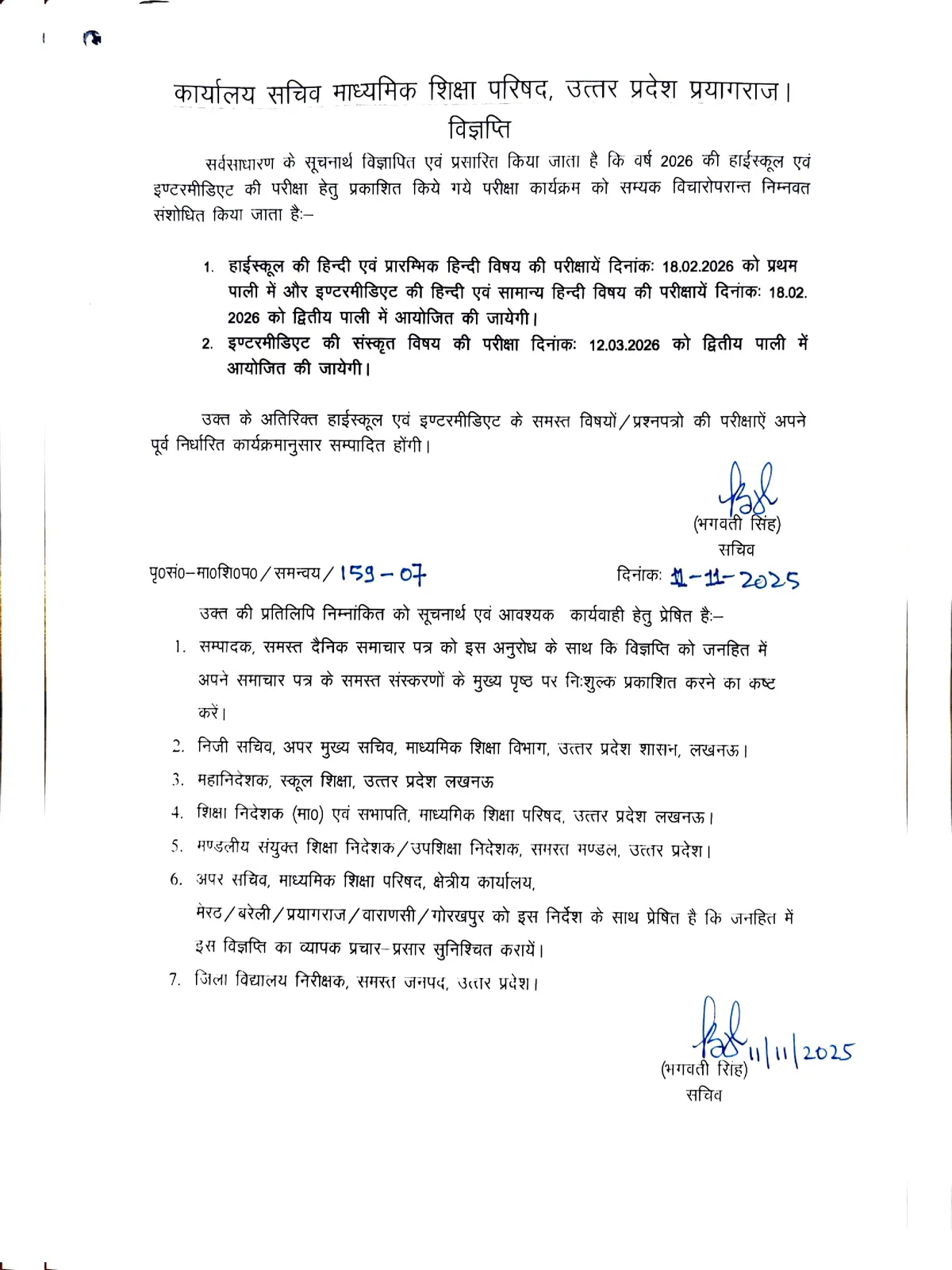 यूपी बोर्ड की 10वीं और 12वीं की परीक्षा 2026 की डेटशीट जारी कर दी गई है। दोनों परीक्षाएं एक साथ 18 फरवरी 2026 से शुरू होकर 12 मार्च 2026 तक चलेंगी। बोर्ड सचिव भगवती सिंह के अनुसार, परीक्षाएं पहले की तरह दो पालियों में आयोजित होंगी। पहली पाली सुबह 8:30 बजे से 11:45 बजे तक और दूसरी पाली दोपहर 2:00 बजे से शाम 5:15 बजे तक होगी। इंटरमीडिएट (कक्षा 12) की परीक्षा 18 फरवरी को सामान्य हिंदी विषय से शुरू होगी।