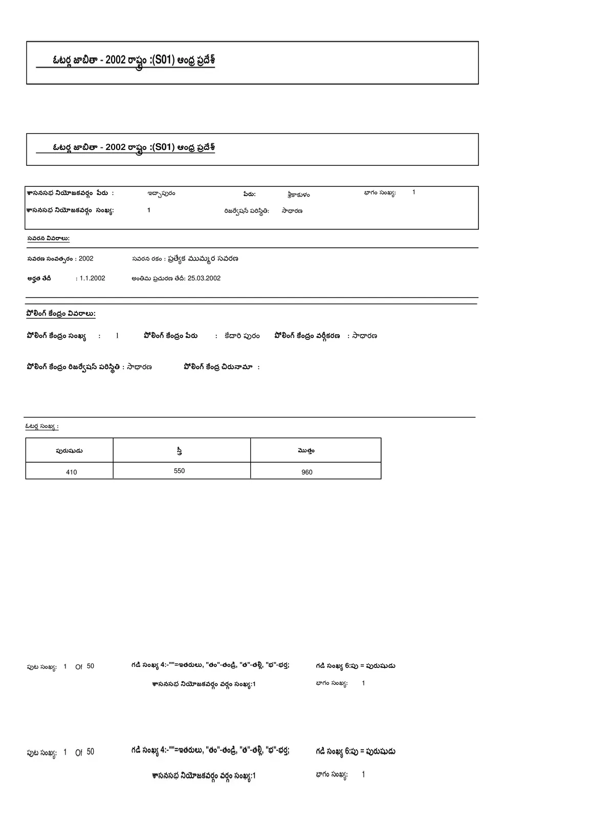 Download Voter List 2002 Andhra Pradesh District Wise Srikakulam District SIR of Electoral Roll – 2002 Sl. No. Assembly Constituency No. of Polling Stations Link to View 1 01-Ichapuram 153 View 2 02-Sompeta 175 View 3 03-Tekkali 169 View 4 04-Harichandrapuram 179 View 5 05-Narasannapeta 163 View 6 06-Pathapatnam 154 View 7 07-Kotturu 174 View 8 13-Vanukuru 184 View 9 14-Palakonda 149 View 10 15-Amadalavalasa 156 View 11 16-Srikakulam 199 View 12 17-Etcherla 168 View